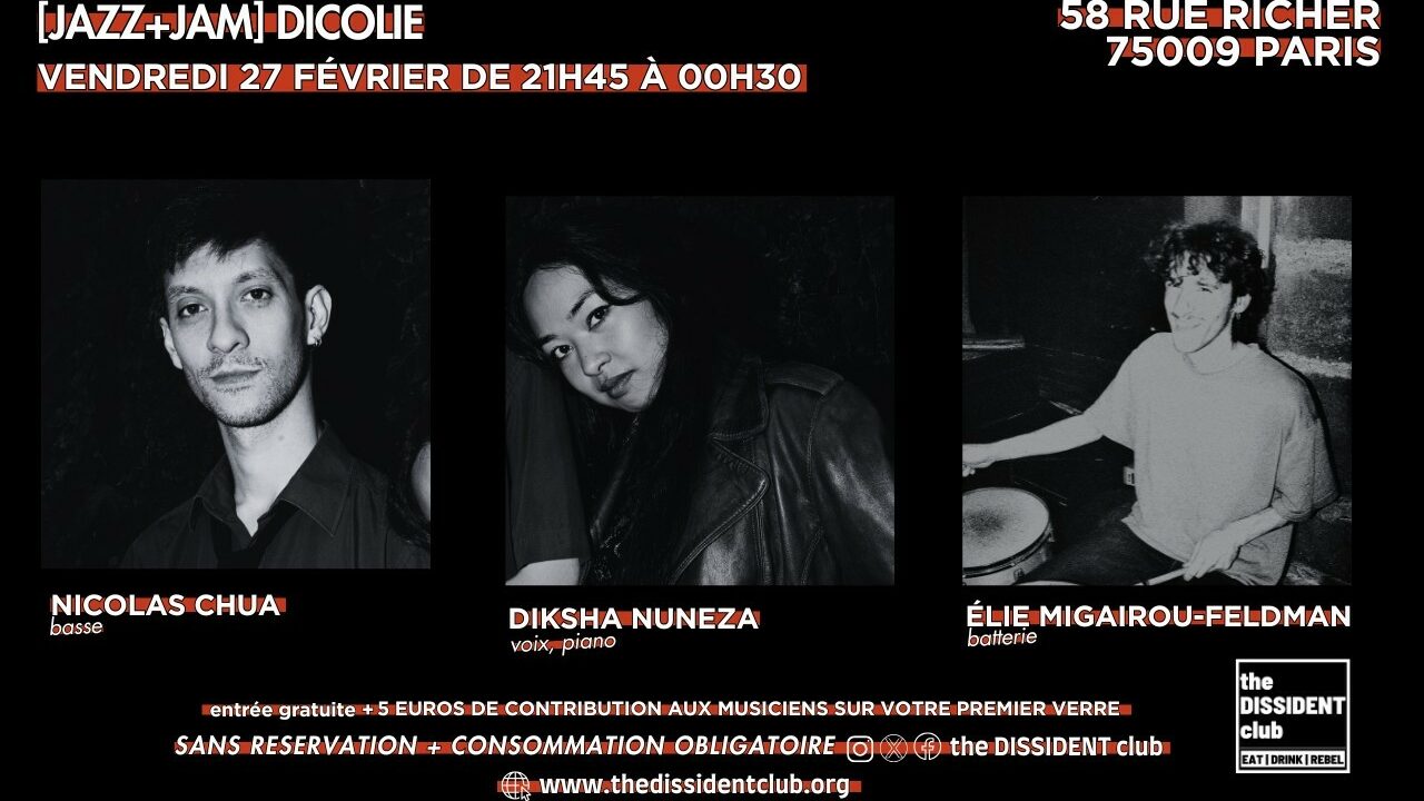 Diksha Nuneza (chant / piano), Nicolas Chua (basse) et Élie Migairou-Feldman (batterie) explorent l’énergie vibrante de l’acid jazz. Groove puissant, rythmes urbains et harmonies soulful se mêlent dans un set électrisant. Un trio complice qui fait monter la fièvre et invite au mouvement. Diksha Nuneza (chant / piano) Nicolas Chua (basse) Élie Migairou-Feldman (batterie)
