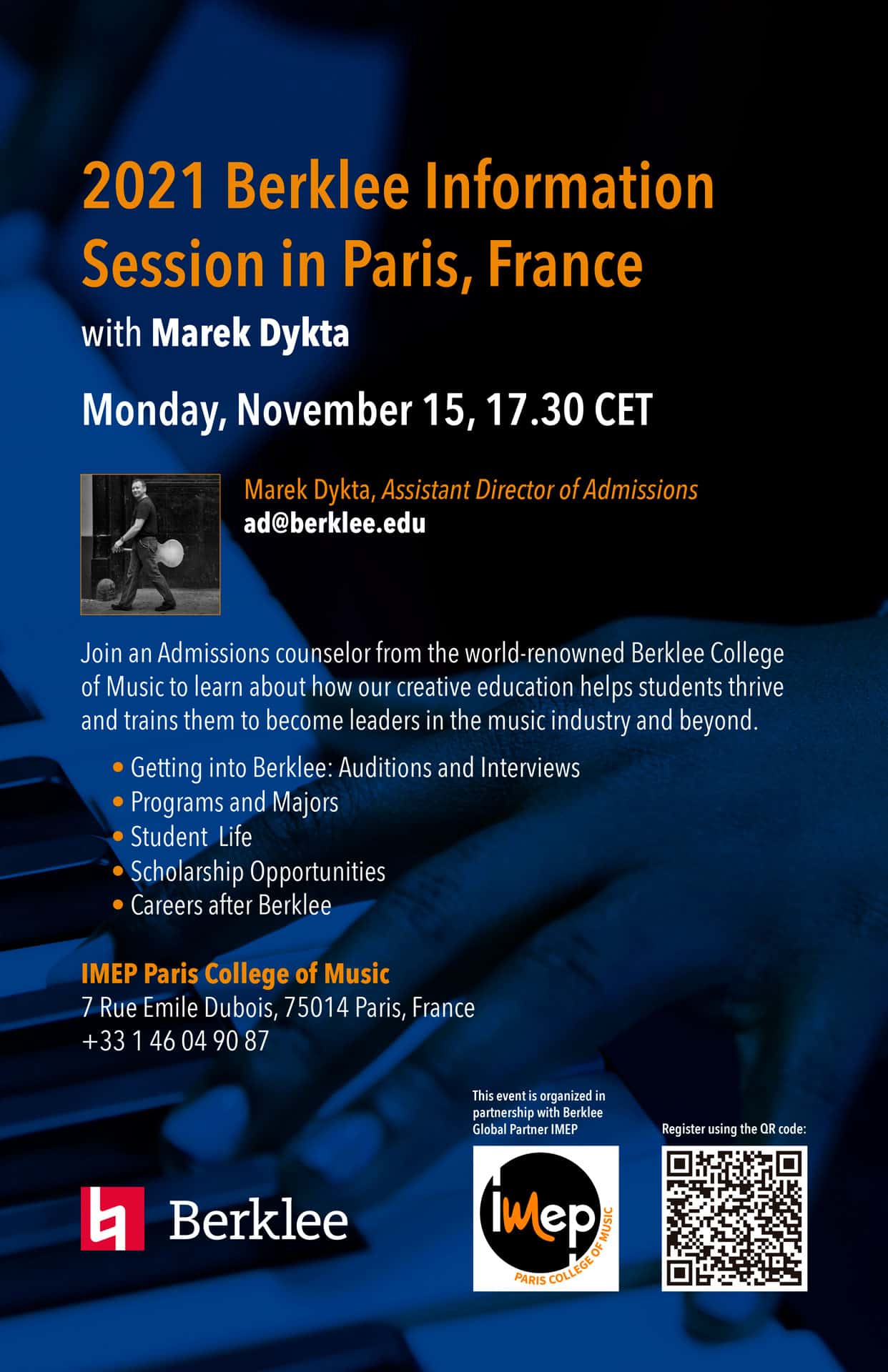 Nous vous donnons rendez-vous le lundi 15 novembre pour une réunion d’informations en présence de Marek Dykta, assistant directeur aux admissions de Berklee College of Music.
