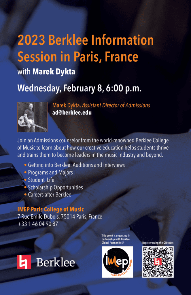 Marek Dykta, assistant directeur aux admissions de Berklee College of Music sera à l’IMEP de 18h à 19h30 pour répondre à toutes vos questions sur les admissions à l’école américaine, la vie sur le campus..