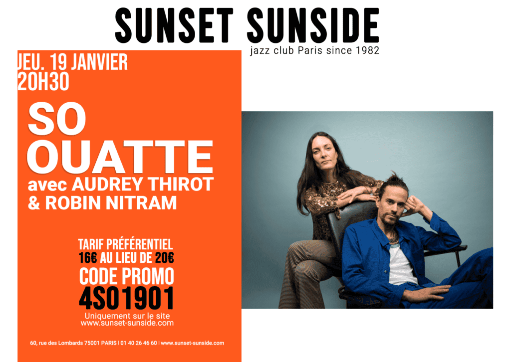 So Ouatte est le duo de jazz formé en 2016 par la rencontre des univers musicaux de la chanteuse Audrey Thirot et du guitariste Robin Nitram. Le duo, qui laisse la part belle à l’improvisation et au ressenti du moment, présente pour la première fois « A Ray of Sun », création qui allie compositions et standards de jazz revisités avec des paroles polyglottes… Laissez-vous surprendre !