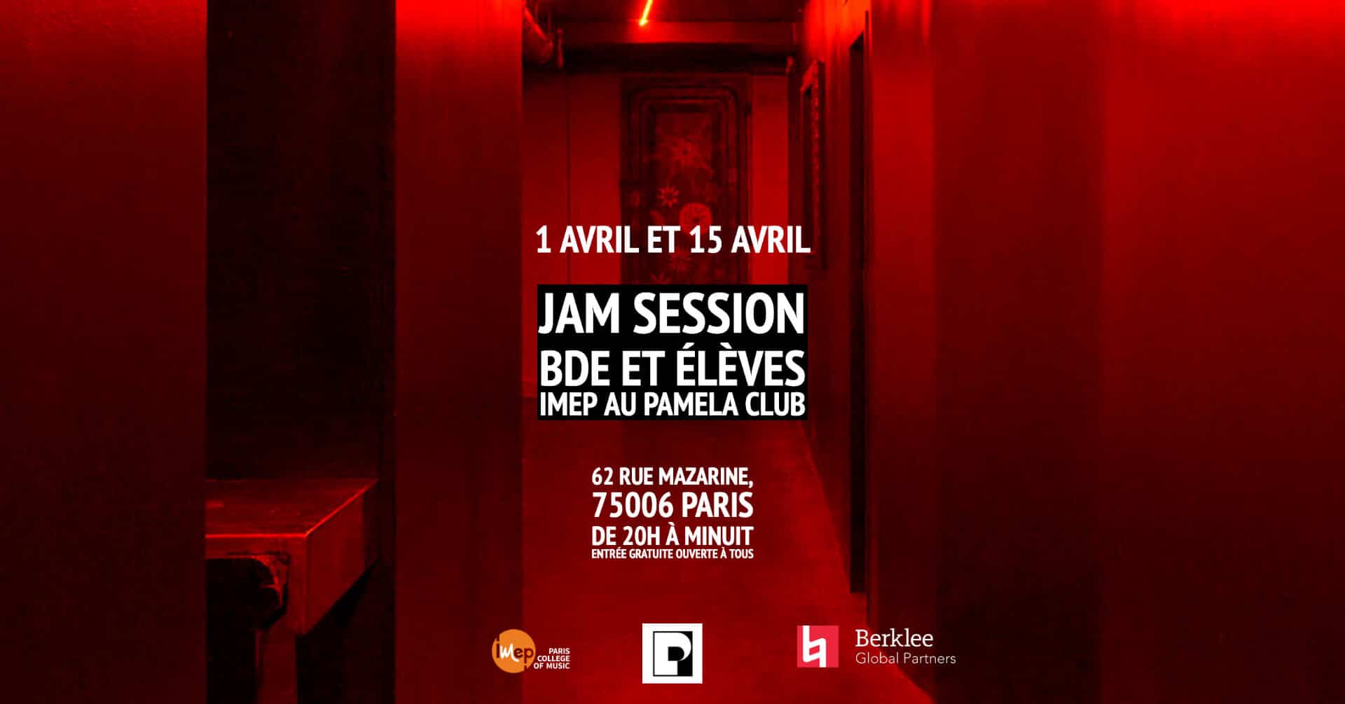 Les élèves et professeurs de l’IMEP • Paris College of Music vous invitent les vendredis 1er et 15 avril pour deux jam sessions au Pamela Club. Nous vous attendons nombreux !