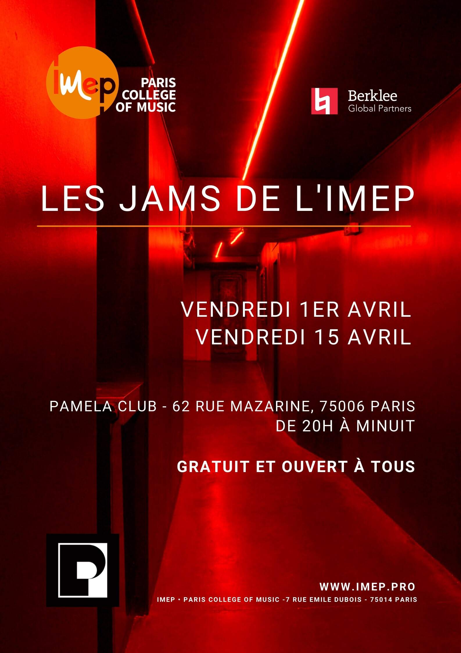 Dates : Le vendredi 1er avril : Jam Session des élèves de l’IMEP • Paris College of Music animée par Bernard Vidal et le vendredi 15 avril : Jam Session du Bureau des Elèves de l’IMEP • Paris College of Music.