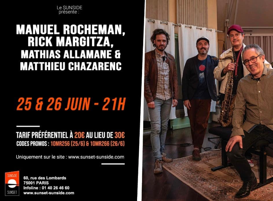 Manuel Rocheman, professeur de piano de l’IMEP, vous invite ce vendredi et ce samedi au Sunset Sunside, pour deux concerts avec son nouvel quartet, le Manuel Rocheman Quartet, avec la participation de Rick Margitza au saxophone (aussi professeur de l’IMEP), de Mathias Allamane à la contrebasse et de Matthieu Chazarenc à la batterie.
